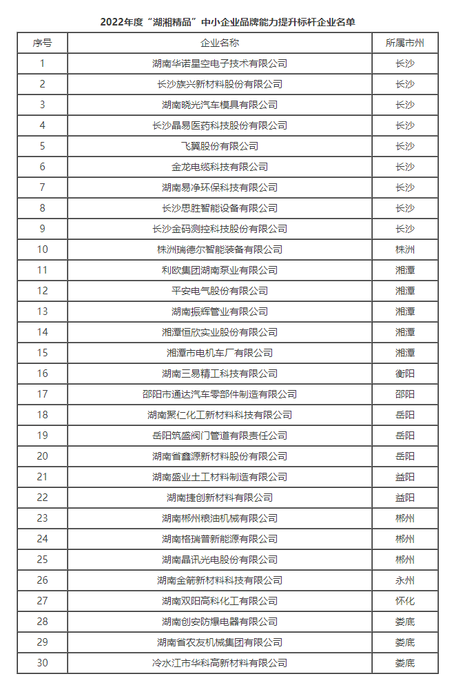 根據《“湖湘精品”中小企業(yè)品牌能力提升三年行動計劃(2021-2023年)》和《關于征集2022年度“湖湘精品”中小企業(yè)品牌能力提升標桿企業(yè)的通知》要求,經試點企業(yè)申報、市州工信局推薦、專家評審及公示等程序,省工信廳遴選出30家企業(yè)為2022年度“湖湘精品”中小企業(yè)品牌能力提升標桿企業(yè),現予公布。