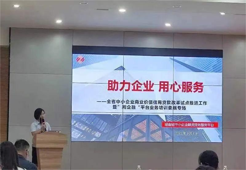 2022年9月6日下午,湖南省中小企業(yè)商業(yè)價值信用貸款改革暨“湘企融”平臺業(yè)務及融資服務能力提升培訓活動在婁底經開區(qū)創(chuàng)新大廈六樓舉行。此次活動由湖南省工信廳指導,省中小企業(yè)服務中心、市工信局主辦,湖南省中小企業(yè)融資股份有限公司承辦,市中小企業(yè)公共服務平臺協(xié)辦。